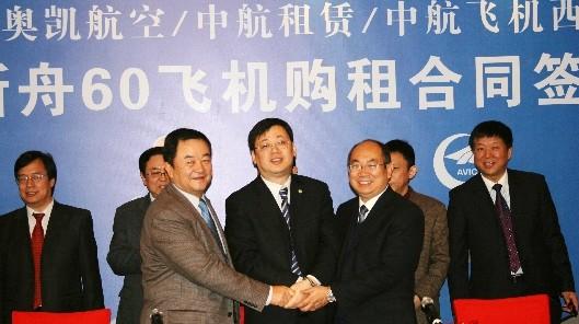 2013年1月18日,奧凱航空與中航國際租賃公司、西安飛機(jī)國際航空制造股份有限公司在北京簽署3架新舟60飛機(jī)購租合同。奧凱航空總裁劉偉寧;西飛集團(tuán)公司總經(jīng)理、黨委書記、中航飛機(jī)西飛黨委書記宋水云;中航租賃總經(jīng)理趙宏偉等領(lǐng)導(dǎo)在購租合同上簽字。