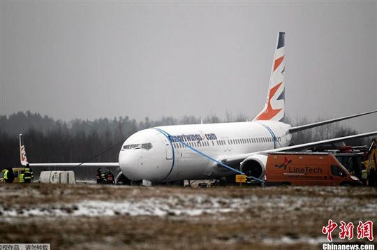 13日波蘭一架波音737客機降落后滑出跑道