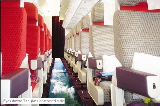 據(jù)英國(guó)《每日鏡報(bào)》4月1日?qǐng)?bào)道,為了讓乘客真正體會(huì)在空中旅行的感覺(jué),英國(guó)維珍航空公司推出的新式噴氣機(jī)安裝有玻璃地板,讓飛行途中的乘客低頭便可將天空一覽無(wú)遺,真正體會(huì)“在空中行走”的感受。