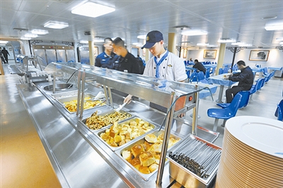 適應航母全時工作理念,航母餐廳在正餐基礎上設置了間餐,提供糕點、水果飲料等,保證了艦員隨時能吃到可口的食品。