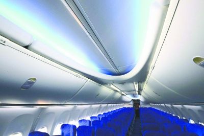 “這架飛機(jī)內(nèi)飾有很大不同,燈光不再是刺眼白色,有白天、夜晚模式,十分柔和!”蔡治洲說(shuō),采用天花板凹形LED燈光照明,根據(jù)登機(jī)、起飛、用餐、休息等不同飛行階段或服務(wù)階段,選擇不同的燈光顏色和明暗度模式。在夜間飛行時(shí),客艙燈光光線由亮變暗,襯托藍(lán)色背椅,如同在藍(lán)色海洋,十分溫馨。行李架改為下拉式的,更易打開(kāi)。