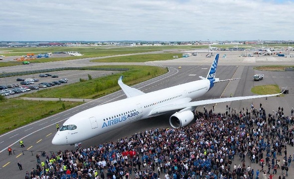 5月13日,在法國圖盧茲,空中客車公司(空客)員工慶賀首架空客A350XWB寬體飛機(jī)完成整體涂裝。