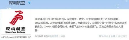 圖說:深圳航空官方微博稱三航班收到威脅信息。 來源:新浪微博