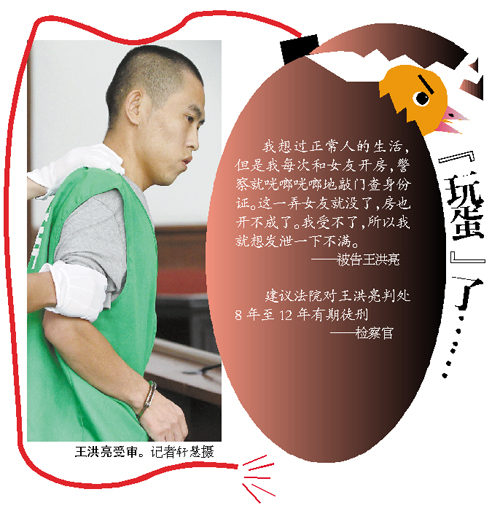 昨日,該案在深圳寶安法院開庭,被告王洪亮在法庭上認罪,并自述犯罪動機:“我想過正常人的生活,但是我每次和女友開房,警察就咣啷咣啷地敲門查身份證。這一弄女友就沒了,房也開不成了。我受不了,所以我就想發(fā)泄一下不滿!