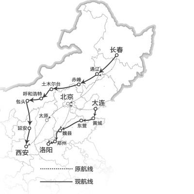 具體方案為:上述航線均繞開北京上空,其中3條向西的航線飛經(jīng)內(nèi)蒙古的土木爾臺(tái)、呼和浩特、包頭抵達(dá)西北、西南地區(qū);4條向南的航線飛經(jīng)大連、青島抵達(dá)中南地區(qū)。比如,原大連—北京—魏縣—鄭州/洛陽(yáng)航線調(diào)整為大連—黃城—東營(yíng)—魏縣—鄭州/洛陽(yáng)(注:中間僅為航班經(jīng)過地點(diǎn)不停。)。