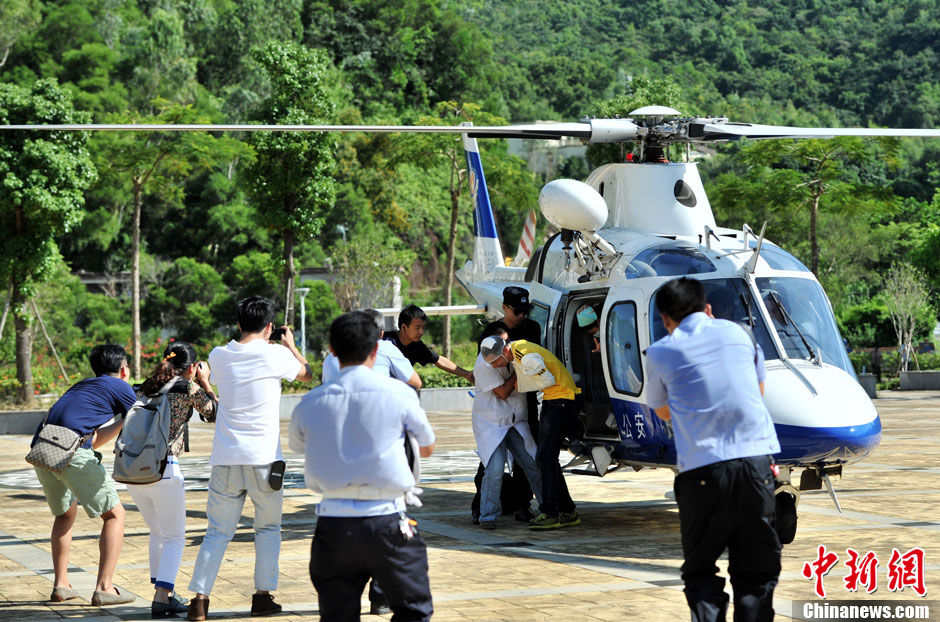 8月27日,深圳市公安局交警支隊(duì)在大鵬新區(qū)西涌舉行突發(fā)交通事故應(yīng)急演練。演練模擬該地區(qū)車(chē)流量大,發(fā)生事故后該路段出現(xiàn)擁堵,處置和救援人員無(wú)法進(jìn)入事故現(xiàn)場(chǎng),急調(diào)警用直升機(jī)飛赴事故現(xiàn)場(chǎng)進(jìn)行處置,轉(zhuǎn)移救治“傷員”。中新社發(fā) 陳文 攝