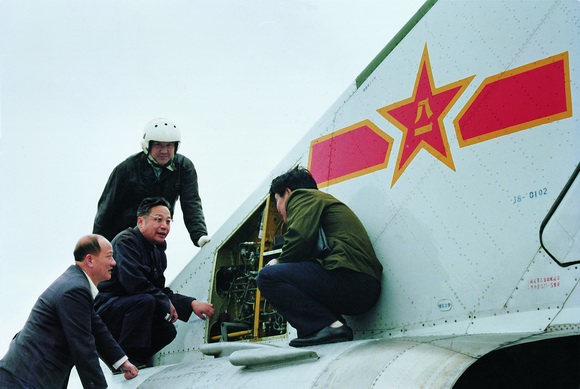 殲-8飛機(jī)0102號(hào)機(jī)試飛中,顧誦芬與飛行員和技術(shù)人員一起研究排除故障。