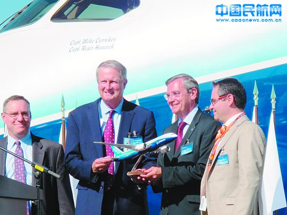 去年8月26日,波音獲頒波音787型號(hào)生產(chǎn)認(rèn)證證書后,安波杰(左二)向歐洲安全局局長(zhǎng)(右二)贈(zèng)送波音787模型。 (劉樹國(guó)/攝)