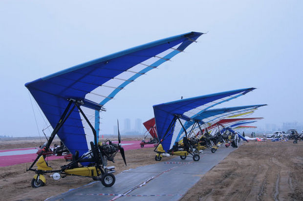 在海口市萬綠園后觀海臺賽點,動力懸掛滑翔機整裝待發(fā)