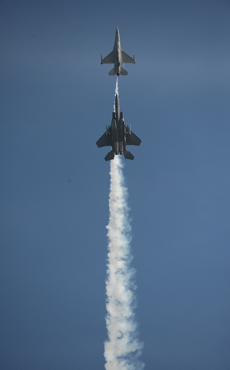 第三屆新加坡航展即將于2月14日正式開幕。新加坡空軍F-15SG型多用途戰(zhàn)斗機與F-16C型戰(zhàn)斗機緊鑼密鼓地進行飛行預演