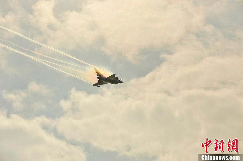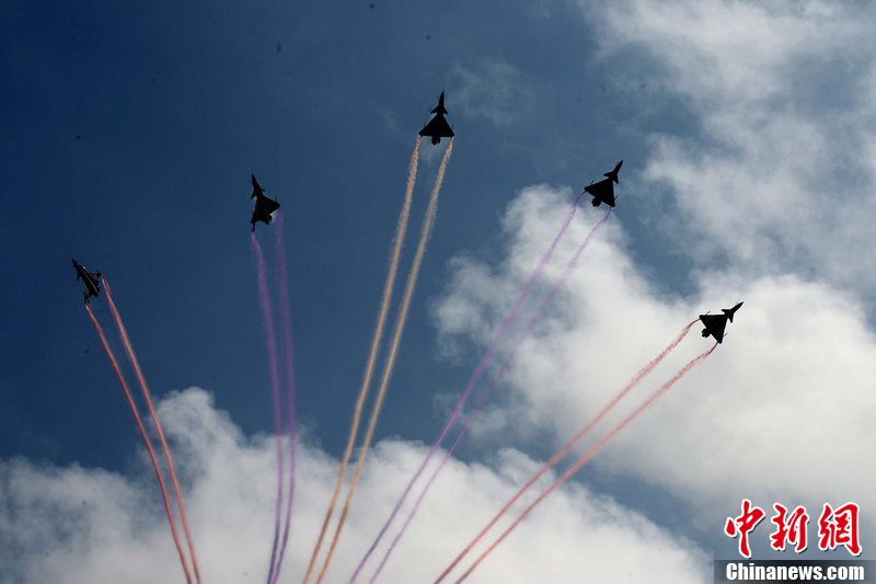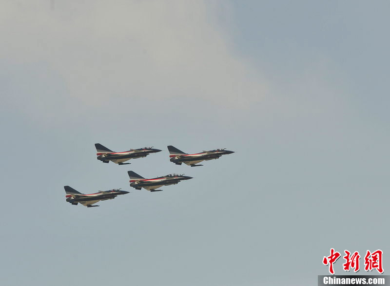 2012年11月10日,廣東省珠海市,八一飛行表演隊(duì)殲十戰(zhàn)機(jī)做編隊(duì)飛行練習(xí)。八一飛行表演隊(duì)將在珠海航展上做精彩編隊(duì)飛行表演。