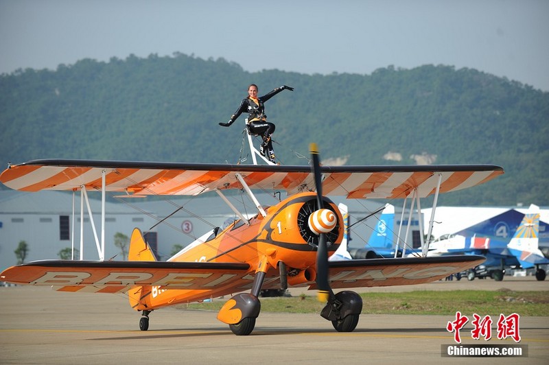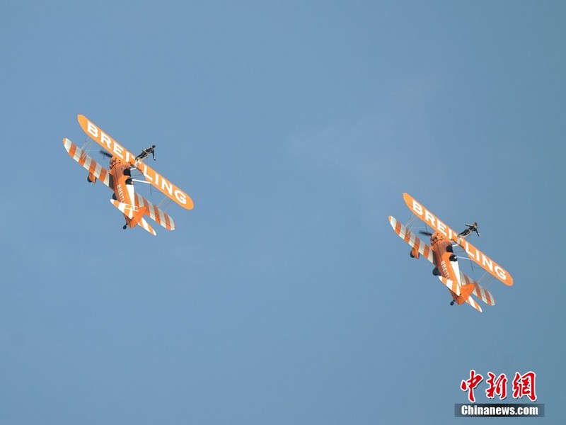 11月11日下午,歐洲“百年靈”機翼行走飛行表演隊表演了精彩的“云中漫步”。兩架飛機上各站有一名美女,在空中表演獨門舞步和雜技,隨飛機一起“云中漫步”,優(yōu)雅精準!