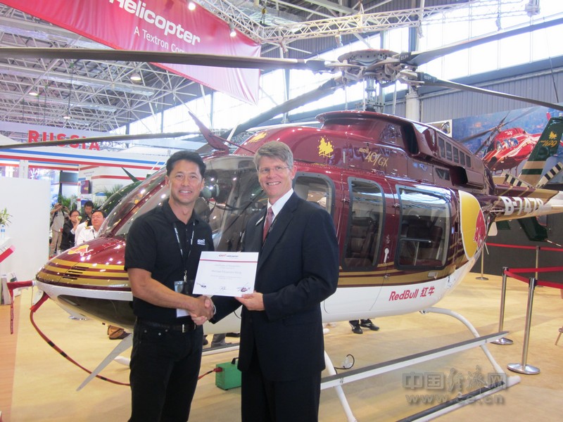 中國(guó)經(jīng)濟(jì)網(wǎng)珠海航展特派記者團(tuán)訊 著名演員兼明星飛行員王敏德獲得貝爾直升機(jī)公司總裁兼首席執(zhí)行官約翰·加里森頒發(fā)“貝爾直升機(jī)中國(guó)大使”證書。王敏德將代表貝爾直升機(jī)公司出席各類活動(dòng)。王敏德是一名合資格的飛行員, 持有貝爾直升機(jī)飛行執(zhí)照。