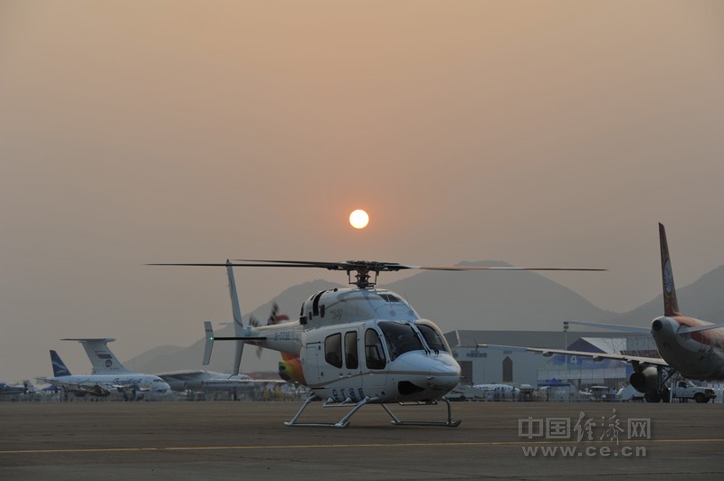 中國經(jīng)濟(jì)網(wǎng)珠海航展特派記者團(tuán)記者王飛 11月15日報(bào)道 金匯通航貝爾直升機(jī)在珠海航展上做展示飛行。
