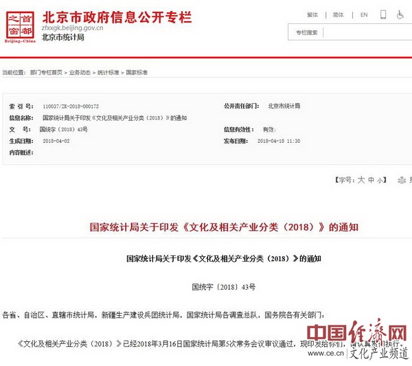 國家統(tǒng)計局關于印發(fā)《文化及相關產業(yè)分類(2018)》的通知