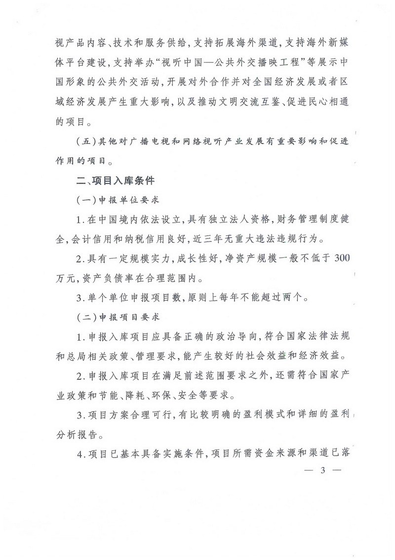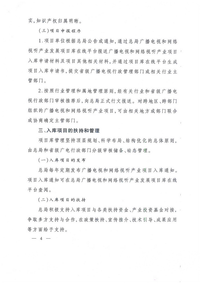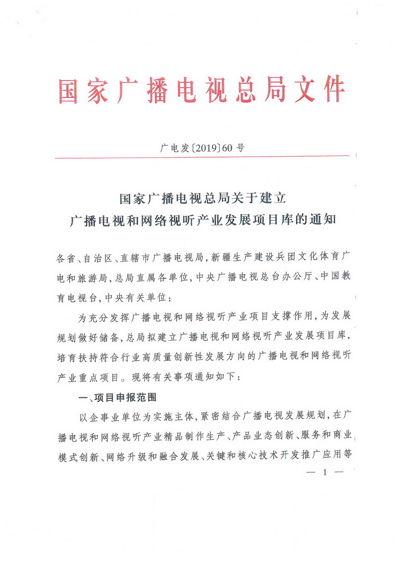 為做好廣播電視和網(wǎng)絡(luò)視聽(tīng)產(chǎn)業(yè)發(fā)展項(xiàng)目庫(kù)的建立、申報(bào)、扶持和管理等工作,總局將盡快制定具體申報(bào)要求、申報(bào)時(shí)限和項(xiàng)目庫(kù)在線平臺(tái)操作指南,有關(guān)內(nèi)容另行通知。