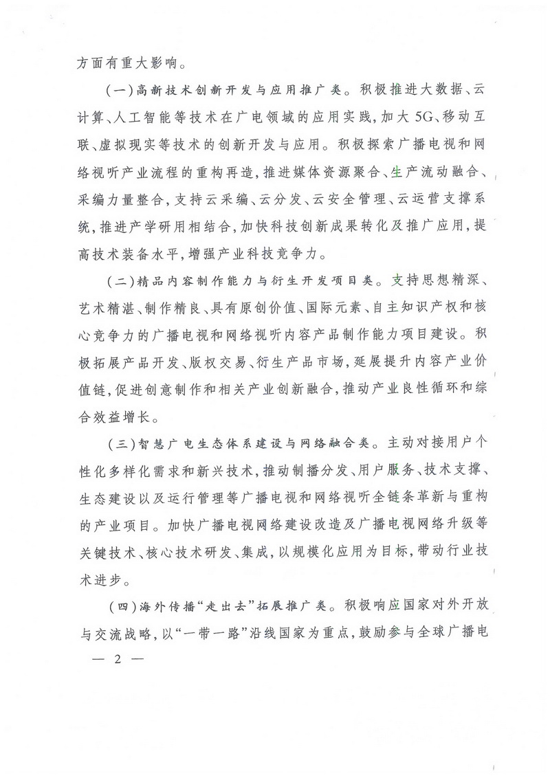 ?。ㄒ唬└咝录夹g(shù)創(chuàng)新開(kāi)發(fā)與應(yīng)用推廣類。積極推進(jìn)大數(shù)據(jù)、云計(jì)算、人工智能等技術(shù)在廣電領(lǐng)域的應(yīng)用實(shí)踐,加大5G、移動(dòng)互聯(lián)、虛擬現(xiàn)實(shí)等技術(shù)的創(chuàng)新開(kāi)發(fā)與應(yīng)用。積極探索廣播電視和網(wǎng)絡(luò)視聽(tīng)產(chǎn)業(yè)流程的重構(gòu)再造,推進(jìn)媒體資源聚合、生產(chǎn)流動(dòng)融合、采編力量整合,支持云采編、云分發(fā)、云安全管理、云運(yùn)營(yíng)支撐系統(tǒng),推進(jìn)產(chǎn)學(xué)研用相結(jié)合,加快科技創(chuàng)新成果轉(zhuǎn)化及推廣應(yīng)用,提高技術(shù)裝備水平,增強(qiáng)產(chǎn)業(yè)科技競(jìng)爭(zhēng)力。