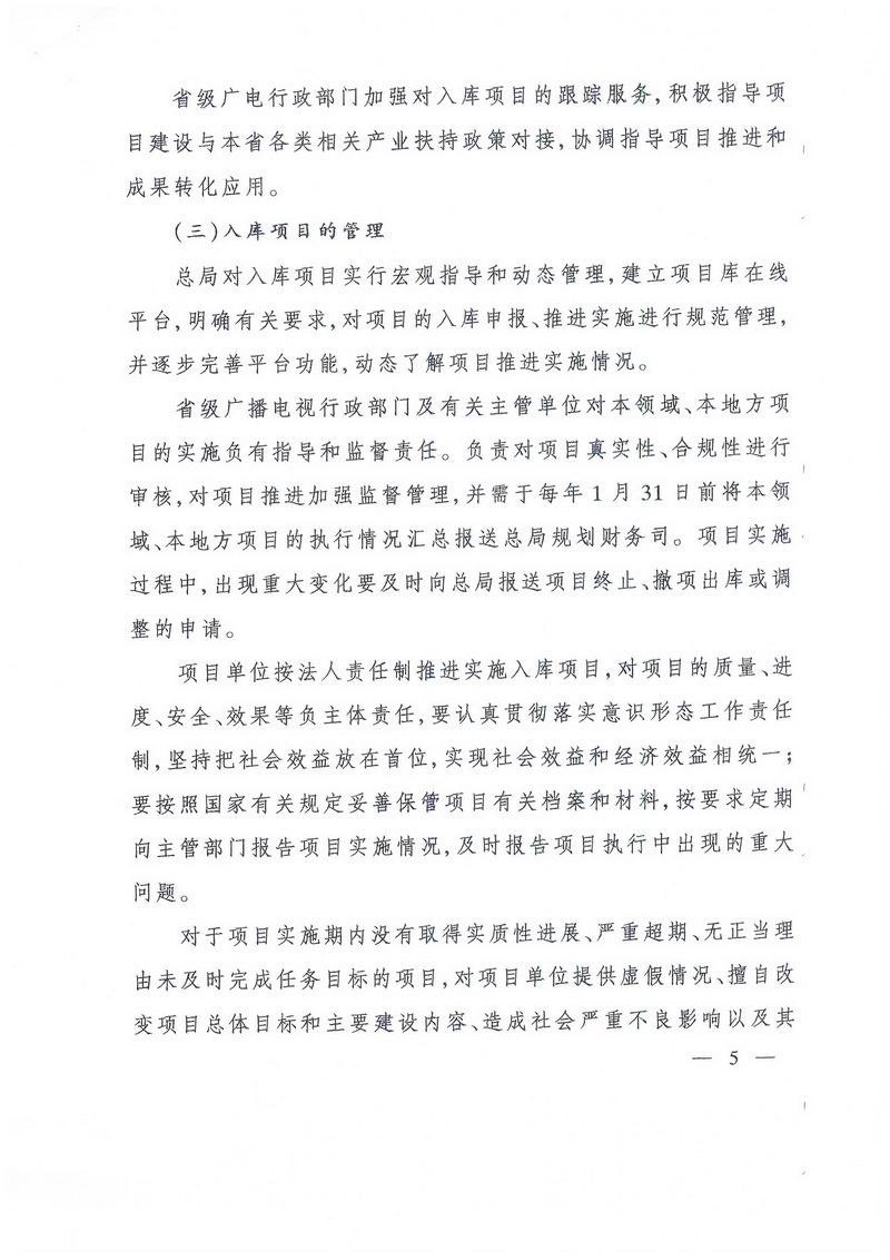 省級(jí)廣播電視行政部門及有關(guān)主管單位對(duì)本領(lǐng)域、本地方項(xiàng)目的實(shí)施負(fù)有指導(dǎo)和監(jiān)督責(zé)任。負(fù)責(zé)對(duì)項(xiàng)目真實(shí)性、合規(guī)性進(jìn)行審核,對(duì)項(xiàng)目推進(jìn)加強(qiáng)監(jiān)督管理,并需于每年1月31日前將本領(lǐng)域、本地方項(xiàng)目的執(zhí)行情況匯總報(bào)送總局規(guī)劃財(cái)務(wù)司。項(xiàng)目實(shí)施過(guò)程中,出現(xiàn)重大變化要及時(shí)向總局報(bào)送項(xiàng)目終止、撤項(xiàng)出庫(kù)或調(diào)整的申請(qǐng)。