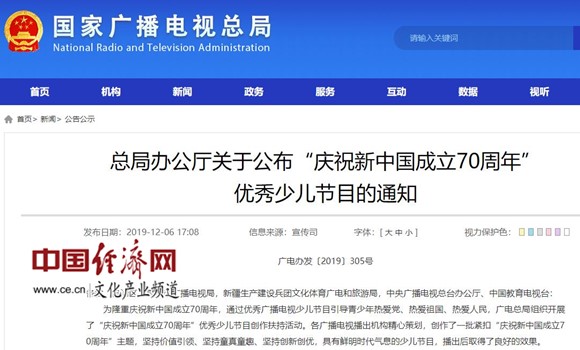 經(jīng)濟(jì)日?qǐng)?bào)-中國(guó)經(jīng)濟(jì)網(wǎng)北京12月9日訊 近日,國(guó)家廣播電視總局辦公廳發(fā)布關(guān)于公布“慶祝新中國(guó)成立70周年”優(yōu)秀少兒節(jié)目的通知。據(jù)經(jīng)濟(jì)日?qǐng)?bào)-中國(guó)經(jīng)濟(jì)網(wǎng)文化產(chǎn)業(yè)頻道(微信號(hào):cewenhua)了解,為慶祝新中國(guó)成立70周年,通過(guò)優(yōu)秀廣播電視少兒節(jié)目引導(dǎo)青少年熱愛黨、熱愛祖國(guó)、熱愛人民,廣電總局組織開展了“慶祝新中國(guó)成立70周年”優(yōu)秀少兒節(jié)目創(chuàng)作扶持活動(dòng)。近期,經(jīng)各省級(jí)廣電行政管理部門、中央廣播電視總臺(tái)推薦,廣電總局組織專家評(píng)審,最終評(píng)選出中央廣播電視總臺(tái)《童聲飄過(guò)70年》、貴陽(yáng)廣播電視臺(tái)《紅帆船—我們家的國(guó)慶節(jié)》等36個(gè)優(yōu)秀廣播電視少兒節(jié)目,廣電總局決定予以通報(bào)表彰,并給予資金扶持。扶持資金由廣電總局下?lián)苤粮魇V播電視局和中央廣播電視總臺(tái),各省局和中央廣播電視總臺(tái)負(fù)責(zé)將扶持資金分發(fā)至所屬獲獎(jiǎng)單位。>>>更多政策可查看中國(guó)經(jīng)濟(jì)網(wǎng)“中國(guó)文化產(chǎn)業(yè)政策庫(kù)”