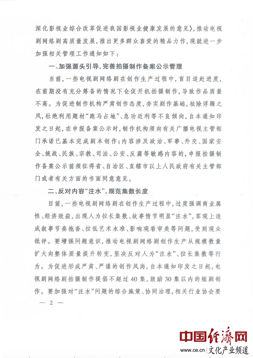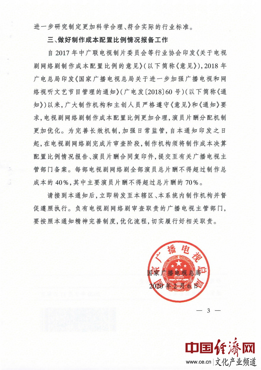 經(jīng)濟(jì)日報(bào)-中國經(jīng)濟(jì)網(wǎng)北京2月20日訊 近日,國家廣播電視總局下發(fā)了《進(jìn)一步加強(qiáng)電視劇網(wǎng)絡(luò)劇創(chuàng)作生產(chǎn)管理有關(guān)工作的通知》(廣電發(fā)﹝2020﹞10號(hào))。據(jù)經(jīng)濟(jì)日報(bào)-中國經(jīng)濟(jì)網(wǎng)文化產(chǎn)業(yè)頻道(微信號(hào):cewenhua)了解,該《通知》要求:一是加強(qiáng)源頭引導(dǎo),在申報(bào)備案公示時(shí),制作機(jī)構(gòu)須向省局承諾已基本完成劇本創(chuàng)作;二是反對內(nèi)容“注水”,電視劇網(wǎng)絡(luò)劇拍攝制作提倡不超過40集,鼓勵(lì)30集以內(nèi)短劇創(chuàng)作;三是做好制作成本配置比例情況報(bào)備工作。在電視劇網(wǎng)絡(luò)劇完成片審查階段,制作機(jī)構(gòu)須將制作成本決算配置比例情況報(bào)告、演員片酬合同復(fù)印件,提交至省局備案。每部電視劇網(wǎng)絡(luò)劇全部演員總片酬不得超過制作總成本的40%,其中主要演員片酬不得超過總片酬的70%。>>>更多政策可查看中國經(jīng)濟(jì)網(wǎng)“中國文化產(chǎn)業(yè)政策庫”