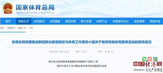 經(jīng)濟(jì)日?qǐng)?bào)-中國(guó)經(jīng)濟(jì)網(wǎng)北京6月3日訊 近日,國(guó)家體育總局發(fā)布了《體育總局統(tǒng)籌推進(jìn)新冠肺炎疫情防控與體育工作領(lǐng)導(dǎo)小組關(guān)于有序恢復(fù)體育賽事活動(dòng)的指導(dǎo)意見(jiàn)》(以下簡(jiǎn)稱“意見(jiàn)”),意見(jiàn)指出,采取預(yù)約、限流等方式,有序開(kāi)放各類運(yùn)動(dòng)場(chǎng)所。  >>>更多政策可查看中國(guó)經(jīng)濟(jì)網(wǎng)“中國(guó)文化產(chǎn)業(yè)政策庫(kù)”