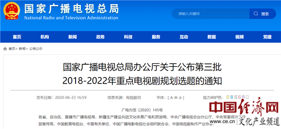 經(jīng)濟(jì)日?qǐng)?bào)-中國(guó)經(jīng)濟(jì)網(wǎng)北京6月24日訊 近日,國(guó)家廣播電視總局辦公廳發(fā)布了《國(guó)家廣播電視總局辦公廳關(guān)于公布第三批2018-2022年重點(diǎn)電視劇規(guī)劃選題的通知》(以下簡(jiǎn)稱“通知”),通知公布了2018-2022年重點(diǎn)電視劇規(guī)劃選題,共計(jì)100部?!豆住贰堕}寧鎮(zhèn)》《大國(guó)擔(dān)當(dāng)》等作品確定為此次重點(diǎn)電視劇規(guī)劃選題。