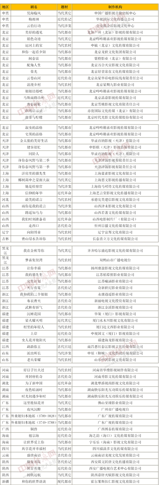 《國家廣播電視總局辦公廳關(guān)于2020年9月全國拍攝制作電視劇備案公示的通知》明確,按題材劃分,當(dāng)代題材50部、1619集,分別占公示總數(shù)的71.43%和71.01%,其中,當(dāng)代都市題材30部963集,當(dāng)代農(nóng)村題材10部349集,當(dāng)代涉案題材4部130集,當(dāng)代其它題材6部177集。