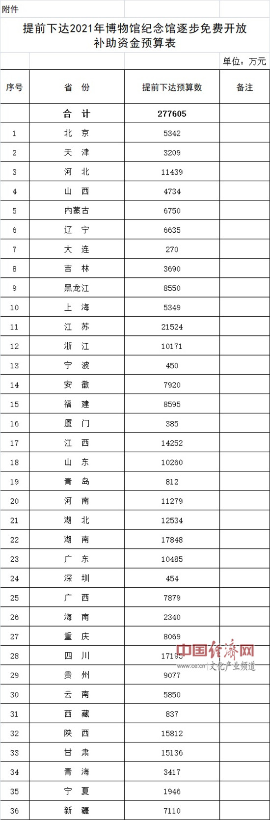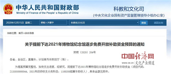 經(jīng)濟(jì)日?qǐng)?bào)-中國(guó)經(jīng)濟(jì)網(wǎng)北京12月15日訊 近日,財(cái)政部官網(wǎng)發(fā)布了《關(guān)于提前下達(dá)2021年博物館紀(jì)念館逐步免費(fèi)開(kāi)放補(bǔ)助資金預(yù)算的通知》,31個(gè)省(自治區(qū)、直轄市)及5個(gè)計(jì)劃單列市補(bǔ)助資金預(yù)算總計(jì)277605萬(wàn)元。
