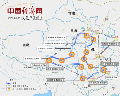 藏羌彝文化產(chǎn)業(yè)走廊依托的城市樞紐包括:四川省成都市、貴州省貴陽市、云南省昆明市、西藏自治區(qū)拉薩市、陜西省西安市、甘肅省蘭州市和青海省西寧市。