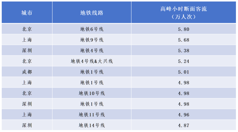 早晚高峰時期,哪條地鐵線乘客最多?根據(jù)《報告》,從線路來看,高峰小時斷面客流最高的10條線路依次是:北京地鐵6號線5.80萬人次、上海地鐵9號線5.68萬人次、深圳地鐵4號線5.38萬人次、北京地鐵4號線&大興線5.24萬人次、成都地鐵1號線5.01萬人次、上海地鐵1號線4.98萬人次、北京地鐵10號線4.98萬人次、深圳地鐵1號線4.98萬人次、上海地鐵11號線4.96萬人次、深圳地鐵14號線4.87萬人次。