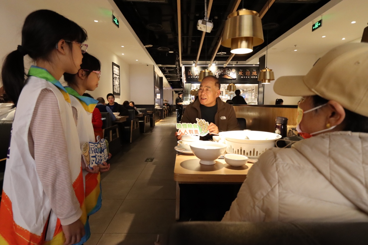 活動將科普與實(shí)踐相結(jié)合,青少年志愿者們學(xué)以致用,在實(shí)踐環(huán)節(jié)化身“制止餐飲浪費(fèi)”宣傳員,向餐廳中的消費(fèi)者宣傳節(jié)糧反浪費(fèi)知識。