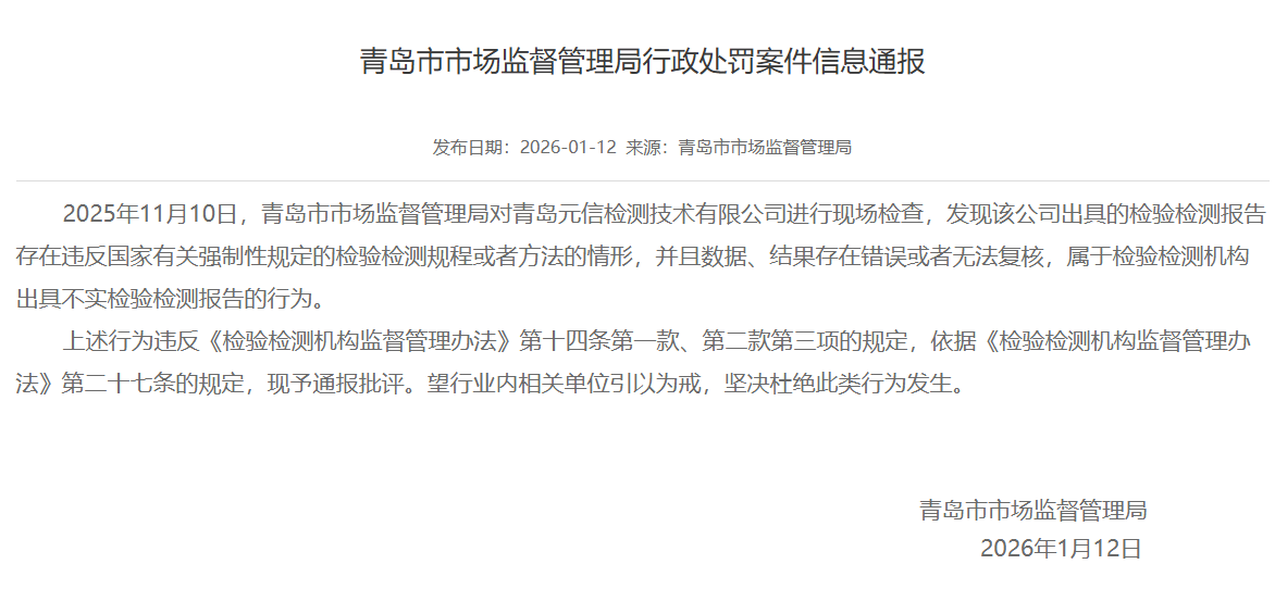 這場圍繞雞蛋角黃素的爭議,最早在今年“3?15”前后引發(fā)廣泛關(guān)注。某打假人連續(xù)發(fā)布檢測報告,稱在商超渠道購買的多款雞蛋中檢出角黃素,并點名黃天鵝等品牌,正式拉開事件序幕。隨著官方抽檢結(jié)果公布,個人送檢“檢出角黃素”與官方抽檢“未檢出角黃素”兩種結(jié)論并存,相關(guān)討論也從食品安全本身,進一步延伸至檢測報告的公信力之爭。其中,為某打假人提供檢測報告的檢測機構(gòu)合規(guī)性備受質(zhì)疑:據(jù)青島市市場監(jiān)管局公開信息,青島元信檢測技術(shù)有限公司因“出具不實檢驗檢測報告”“數(shù)據(jù)無法復(fù)核”等問題,已于2026年1月12日被行政處罰。