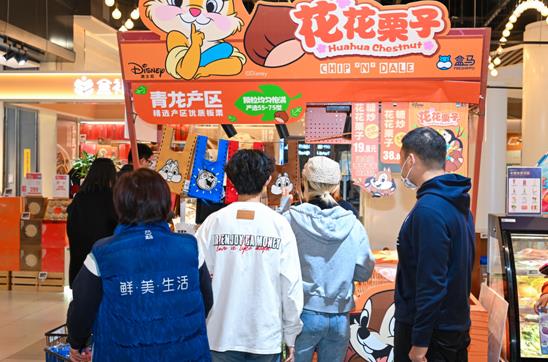 在哈一口氣便能凝結出霧的寒冬,暖呼呼的糖炒栗子最能溫暖人心。在午后的盒馬線下門店,糖炒栗子的檔口已經(jīng)排起了長隊,工作人員將剛炒制出來的新鮮栗子裝進了印有迪士尼人物奇奇蒂蒂形象的紙盒里,遞給消費者?!疤鹛鹋磁吹睦踝?,最適合當冬天小零食”、“沖著這個包裝來買的,太可愛了。”
