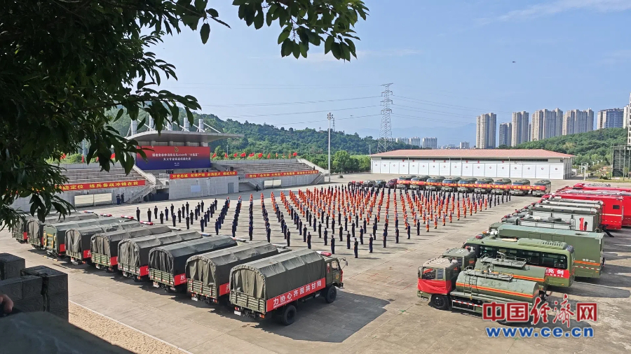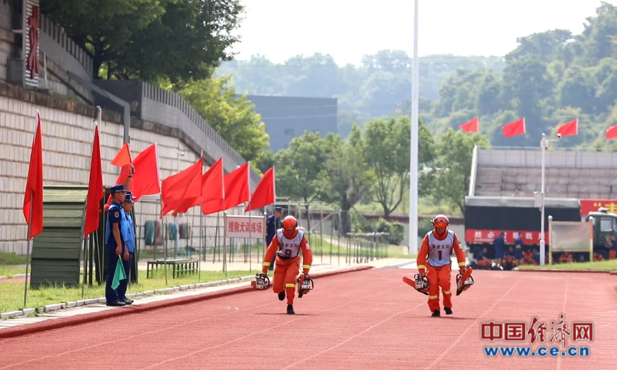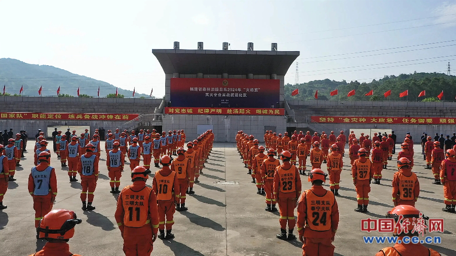 福建省森林消防總隊(duì)2024年“火焰藍(lán)”滅火專業(yè)實(shí)戰(zhàn)技能比武開(kāi)幕式現(xiàn)場(chǎng)。 蔡增欣/攝