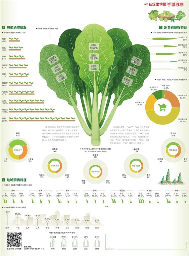 受氣溫偏暖影響,今年春菜提前了半個月左右上市,春菜消費較早升溫。數(shù)據(jù)顯示,薺菜、菜心、春筍、兒菜、豌豆尖、蘆筍、蘆蒿、香椿、婆婆丁成為線上熱銷春菜。其中,蘆蒿、豌豆尖、兒菜銷量分別同比增長250%、172%、132%。