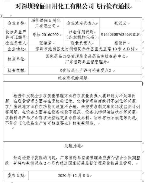 針對檢查中發(fā)現(xiàn)的問題,國家藥監(jiān)局要求廣東省藥品監(jiān)督管理局應(yīng)責(zé)令深圳綿儷日用化工有限公司限期整改,并將相關(guān)情況在2個(gè)月內(nèi)報(bào)送國家藥品監(jiān)督管理局化妝品監(jiān)管司。