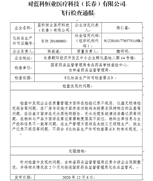 針對檢查中發(fā)現(xiàn)的問題,國家藥監(jiān)局要求吉林省藥品監(jiān)督管理局應(yīng)責(zé)令該企業(yè)限期整改,并將相關(guān)情況在2個月內(nèi)報(bào)送國家藥品監(jiān)督管理局化妝品監(jiān)管司。