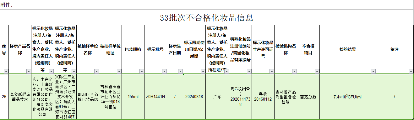中國(guó)經(jīng)濟(jì)網(wǎng)北京11月16日訊(記者楊奇奇)11月15日,國(guó)家藥監(jiān)局發(fā)布《關(guān)于33批次不合格化妝品的通告》顯示,1批次高姿澎湃沁潤(rùn)晶瑩水不合格。