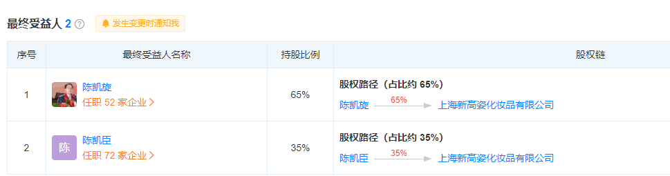 記者查詢(xún)資料顯示,上海新高姿化妝品有限公司共生產(chǎn)了800多款國(guó)產(chǎn)非特殊用途化妝品,其中包括高姿、赫拉、芊嘉、安妍雅等多個(gè)知名化妝品品牌。公司共有九個(gè)子公司,最終受益人為陳凱旋,持股占比65%。