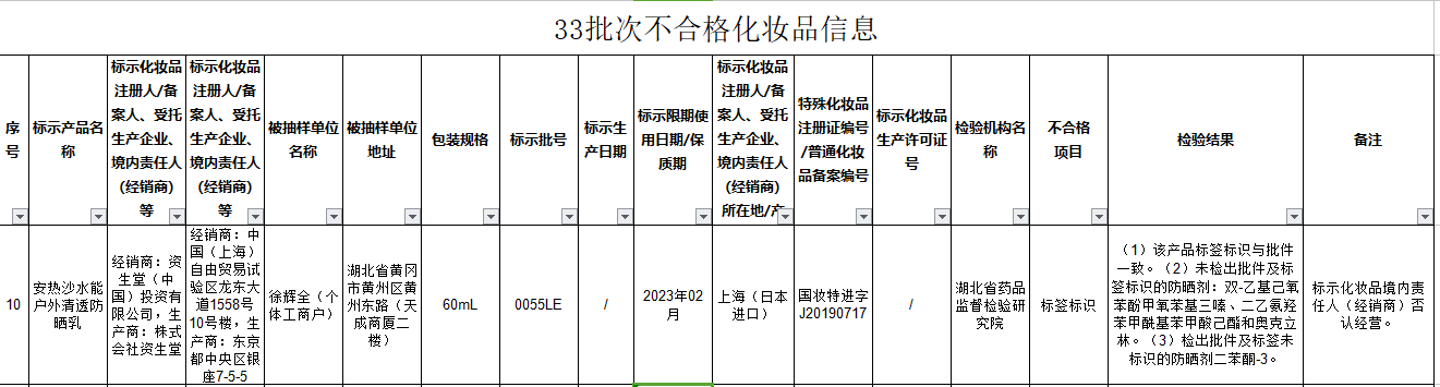 通告顯示,經(jīng)湖北省藥品監(jiān)督檢驗(yàn)研究院檢測(cè),經(jīng)銷商為資生堂(中國(guó))投資有限公司,生產(chǎn)商為株式會(huì)社資生堂銷售的產(chǎn)品安熱沙水能戶外清透防曬乳產(chǎn)品不合格,檢驗(yàn)結(jié)果為未檢出批件及標(biāo)簽標(biāo)識(shí)的防曬劑:雙-乙基己氧苯酚甲氧苯基三嗪、二乙氨羥苯甲酰基苯甲酸己酯和奧克立林;檢出批件及標(biāo)簽未標(biāo)識(shí)的防曬劑二苯酮-3。