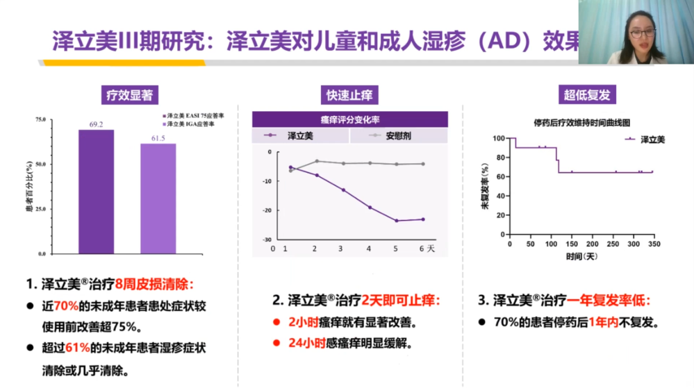 趙琰教授還分享了澤立美重要臨床數(shù)據(jù):"在為期8周的III期臨床試驗中,澤立美組61.5%的患者實現(xiàn)皮損完全清除,瘙癢改善最快僅需2小時。更可喜的是,停藥1年后仍有70%患者維持緩解狀態(tài)。"相比美國市場1400美元/支的售價,該藥國內(nèi)定價僅360元,大大減輕患者經(jīng)濟負擔。
