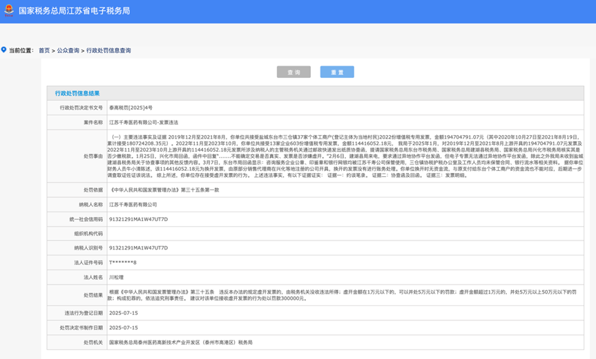 《中國經(jīng)營報》記者查詢國家稅務(wù)總局江蘇省電子稅務(wù)局、信用中國等網(wǎng)站發(fā)現(xiàn),7月15日,國家稅務(wù)總局泰州醫(yī)藥高新技術(shù)產(chǎn)業(yè)開發(fā)區(qū)(泰州市高港區(qū))稅務(wù)局對江蘇千壽醫(yī)藥發(fā)票違法行為進(jìn)行行政處罰,處罰金額為30萬元。