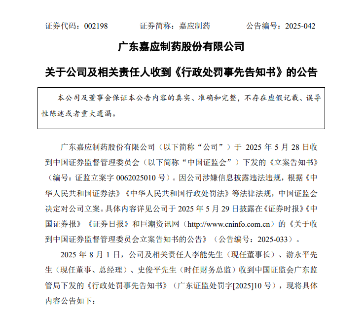 中國經(jīng)濟網(wǎng)北京8月5日訊(記者郭文培)8月4日,廣東嘉應制藥股份有限公司(以下簡稱嘉應制藥)披露公告,因2.2億元關聯(lián)資金拆借未及時披露,該公司及現(xiàn)任董事長李能、現(xiàn)任董事兼總經(jīng)理游永平、時任財務總監(jiān)史俊平收到中國證監(jiān)會廣東監(jiān)管局下發(fā)的《行政處罰事先告知書》,擬被處以共計490萬元罰款。