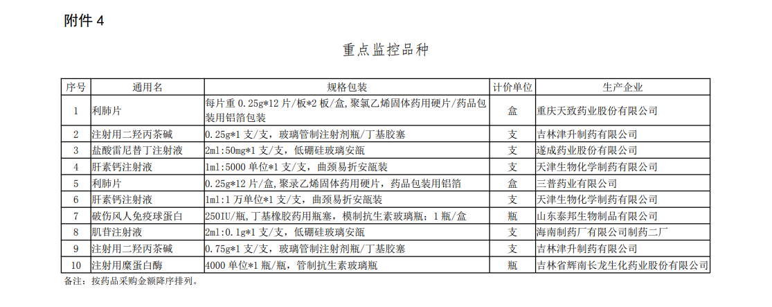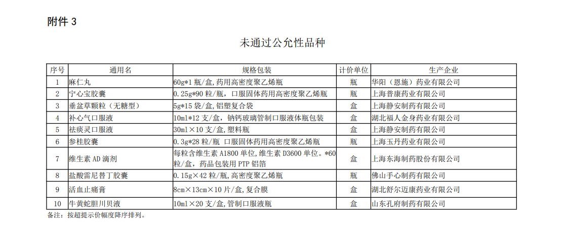 譬如,新申請超“黃線”品種名單中,北京同仁堂科技發(fā)展股份有限公司制藥廠麻仁潤腸軟膠囊、云南白藥集團股份有限公司云南白藥氣霧劑系獨家品種;原在庫超“黃線”品種名單中,浙江泰利森藥業(yè)有限公司瑞格列奈二甲雙胍片(II)是獨家品種;未通過公允性品種名單中,湖北福人金身藥業(yè)有限公司補心氣口服液、上海玉丹藥業(yè)有限公司參桂膠囊是獨家品種;重點監(jiān)控品種名單中,吉林津升制藥有限公司注射用二羥丙茶堿為獨家品種。