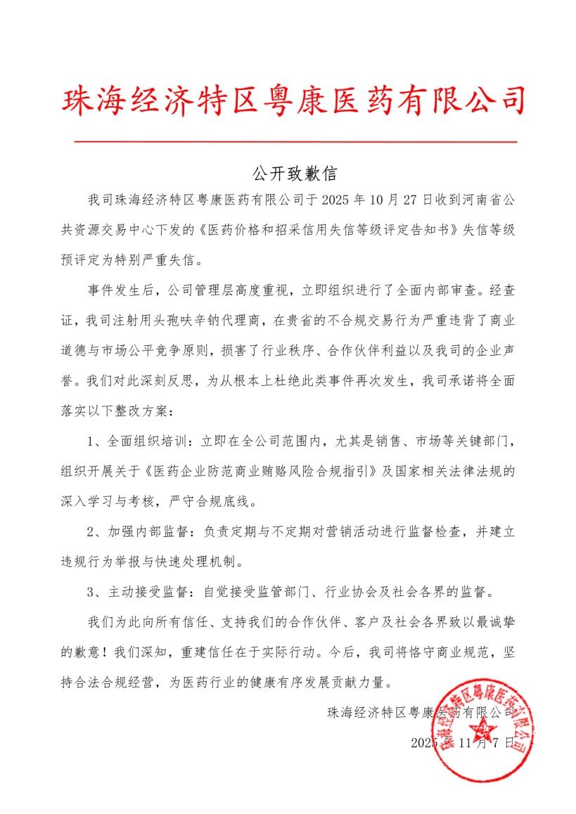 根據(jù)公開致歉信,在涉及哈爾濱譽衡制藥有限公司產(chǎn)品的配送環(huán)節(jié)中,相關(guān)配送企業(yè)存在不合規(guī)的交易行為。吉林四環(huán)制藥有限公司生產(chǎn)的產(chǎn)品“腦苷肌肽注射液”,其合作配送企業(yè)在河南省存在不合規(guī)交易行為。珠海經(jīng)濟特區(qū)粵康醫(yī)藥有限公司注射用頭孢呋辛鈉代理商,在河南省發(fā)生不合規(guī)交易行為,粵康醫(yī)藥收到河南省公共資源交易中心下發(fā)的《醫(yī)藥價格和招采信用失信等級評定告知書》失信等級預(yù)評定為特別嚴重失信。