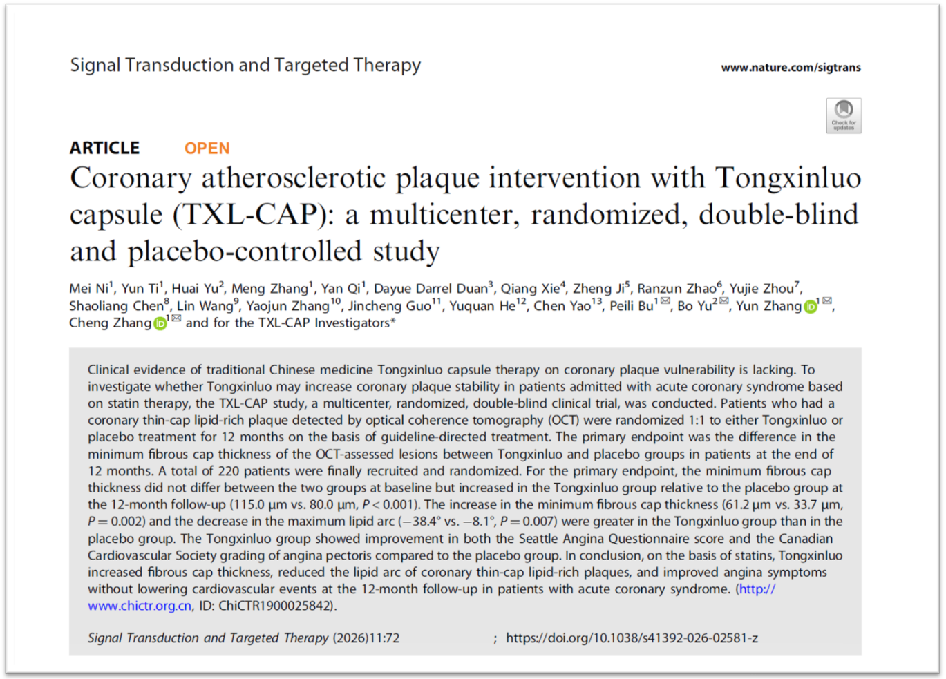 2月24日,“通心絡膠囊干預急性冠脈綜合征冠狀動脈粥樣硬化斑塊的隨機、雙盲、安慰劑平行對照、多中心臨床研究(TXL-CAP多中心研究)”論文在施普林格?自然集團(Springer Nature)主管的國際權(quán)威學術(shù)期刊《信號轉(zhuǎn)導與靶向治療》(Signal Transduction and Targeted Therapy,簡稱STTT,影響因子52.7)在線發(fā)表。結(jié)果顯示,在他汀等現(xiàn)代標準治療基礎(chǔ)上聯(lián)合使用通心絡,可顯著增加急性冠狀動脈綜合征患者冠狀動脈易損斑塊纖維帽厚度,減小斑塊脂質(zhì)弧度,并改善心絞痛癥狀,為臨床穩(wěn)定冠狀動脈斑塊提供了有效的治療手段。