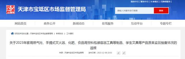 2023年,寶坻區(qū)市場(chǎng)監(jiān)管局開展了家用燃?xì)庠?、手提式滅火器、化肥、食品用塑料包裝容器工具等制品、學(xué)生文具等產(chǎn)品質(zhì)量監(jiān)督抽查。共抽查產(chǎn)品100批次,不合格10批次,不合格發(fā)現(xiàn)率10%。