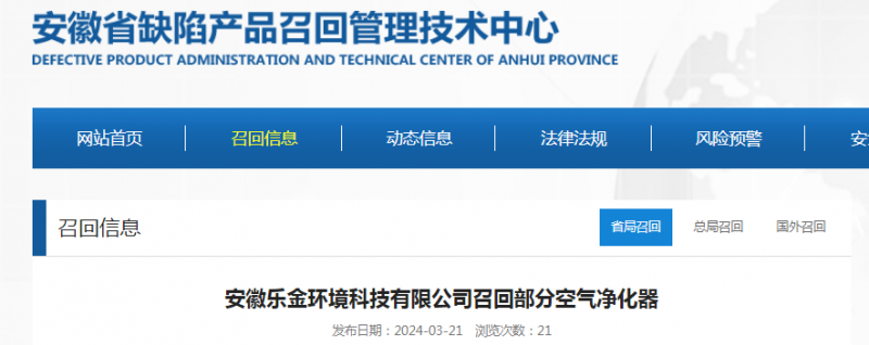 日前,安徽樂金環(huán)境科技有限公司按照《消費品召回管理暫行規(guī)定》的要求,向安徽省市場監(jiān)督管理局、蕪湖市市場監(jiān)督管理局報告了召回計劃,將自即日起,召回2023年3月6日生產(chǎn)的空氣凈化器(規(guī)格型號為KJ700F-P70 72W),涉及數(shù)量為28臺。