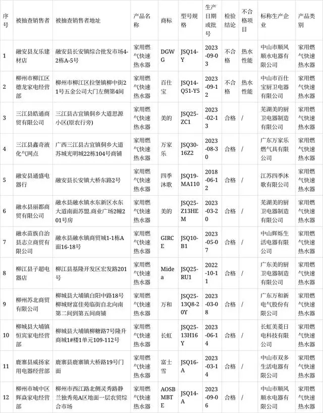其中,2023年共抽查12家銷售者的12批次家用燃?xì)饪焖贌崴鳟a(chǎn)品,檢驗(yàn)結(jié)果不合格2批次,不合格檢出率為16.67%。重點(diǎn)對產(chǎn)品的安全裝置結(jié)構(gòu)要求、燃?xì)庀到y(tǒng)氣密性、燃燒工況、熱水性能、表面溫升、銘牌等6個(gè)項(xiàng)目進(jìn)行檢驗(yàn),不合格項(xiàng)目涉及熱水性能。