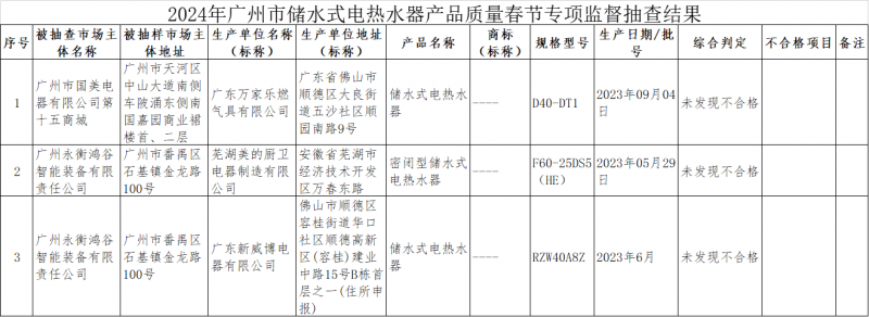 近日,廣州市市場監(jiān)督管理局對儲水式電熱水器產(chǎn)品質(zhì)量進行了專項監(jiān)督抽查,共抽查了3批次樣品,經(jīng)檢驗,未發(fā)現(xiàn)不合格。